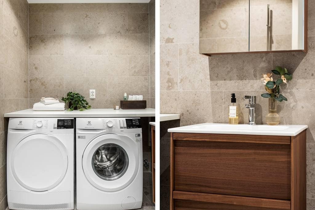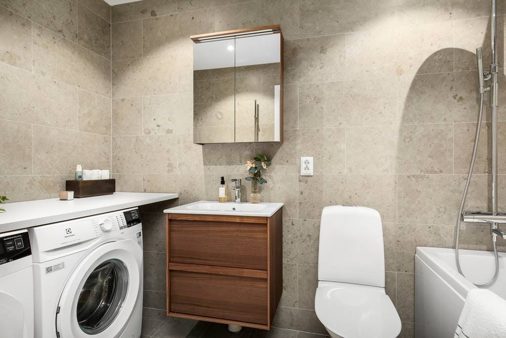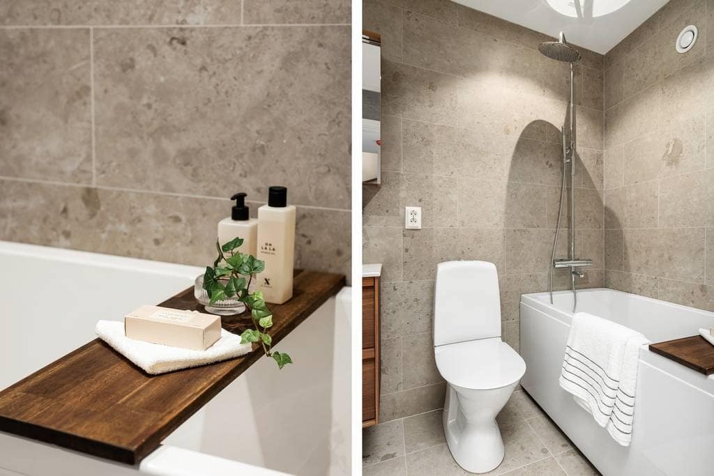 Noggrant utvalda material genomsyrar de moderna badrummen med bland annat klinker i carrarramarmor-mönstrad granitkeramik. Bostäderna kommer även att erbjudas kalkstensmönstrat kakel och klinkers som tillval