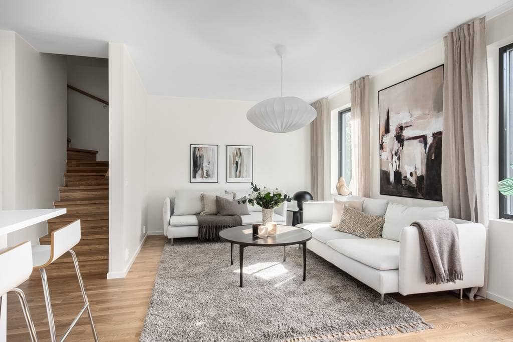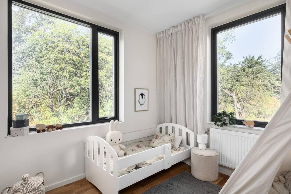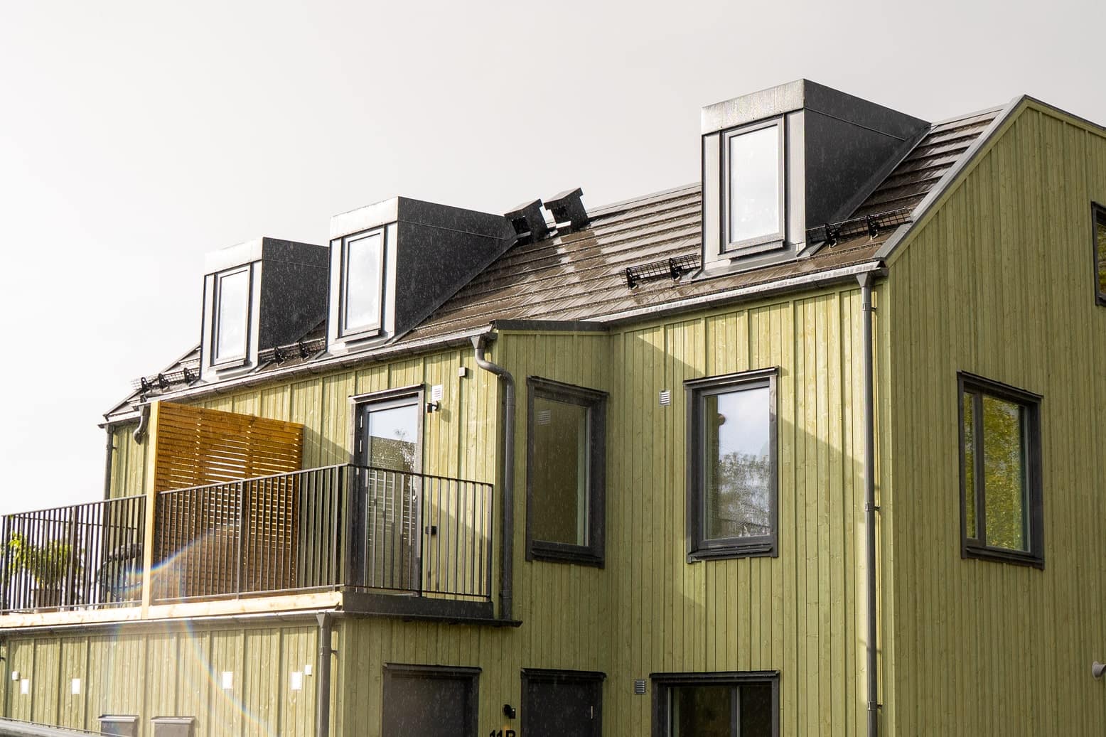 Här hittar ni tre sovrum och ett vardagsrum. Från övervåningen nås den 15-20 kvm stora takterassen från vardagsrummet och den 5 kvm stora balkongen från master bedroom. Från övervåningen når ni även det inredda vindsplanet.