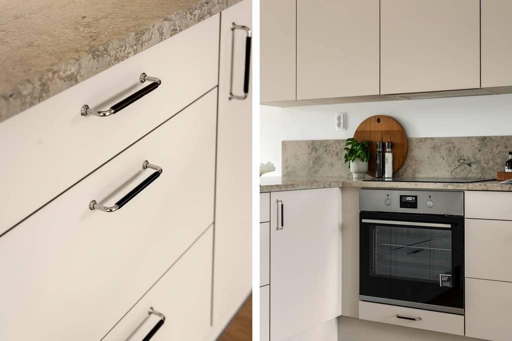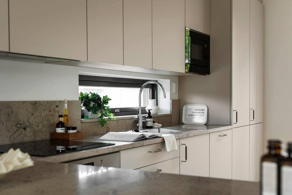 Ett modernt och stilrent kök med fokus på både design och funktionalitet. Köket är optimerat för matlagning i kombination med socialt umgänge genom den öppna planlösningen och den stora härliga köksön.