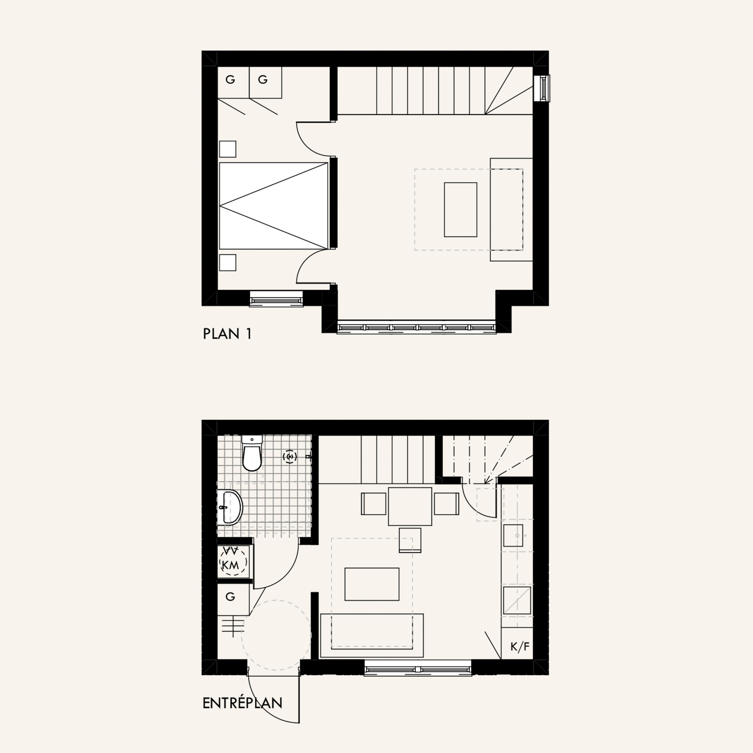 Minivillan med entréplan och källarplan har en totalyta om 48 kvm, varav 24 kvm BOA och 24 kvm BIA. Här får du två rum och kök fördelat på ett entréplan ovan mark och ett källarplan som ger extra yta utöver boytan, till exempel för förvaring, hobby eller arbetsplats. Materialvalen är desamma som i parhusen i Baggensfjärdshöjden, med finsågad stående träpanel och brutet plåttak utvändigt samt träaltan enligt situationsplan. Invändigt finns genomgående plankgolv i ek där det är trägolv, vitmålade väggar, aluminiumbeklädda träfönster med fönsterbänkar och radiatorskydd, moderna kök och badrum samt vattenburen golvvärme på entréplan, kompletterat med luftvärmepump och frånluftsventilation.