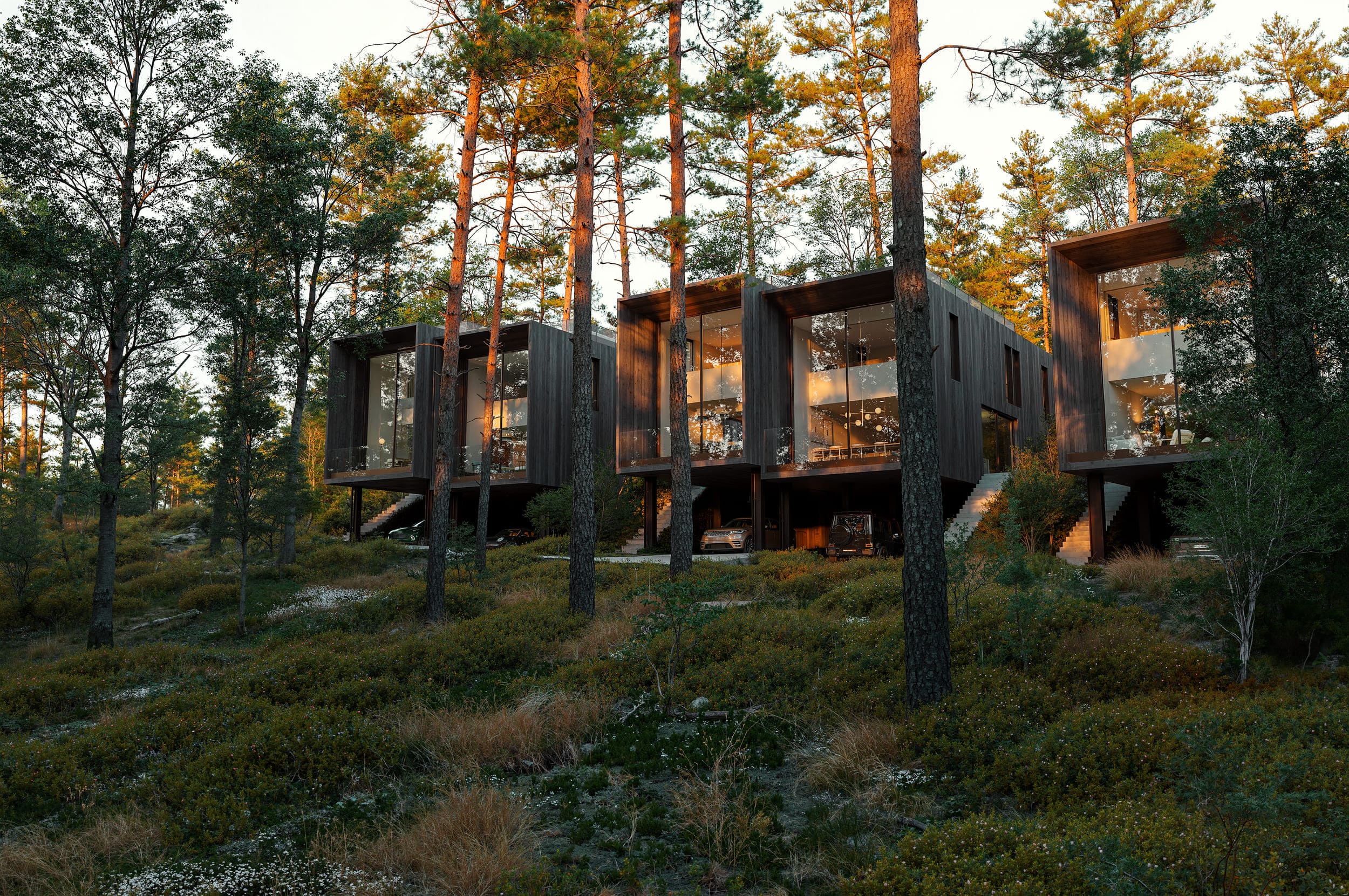 Den första etappen i Tallviken består av parhus ritade av Henrik Schulz Studio. Tallviken erbjuder ett exceptionellt boende med ett arkitektoniskt uttryck som är både modernt och varmt, där fokus ligger på ljus, rymd och funktion. Husen står på diskreta plintar och svävar lätt över marken, vilket gör att de smälter in i omgivningen snarare än tar plats i den. Ett intryck som förstärks av husens rena linjer, stora glasytor och naturliga materialpalett.